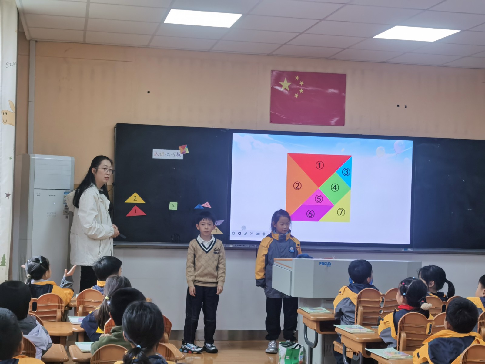 教学中,胡莹老师巧妙融入了AI技术辅助教学,课前利用智能互动平台,整理学生对于七巧板的疑问,并通过数据分析找到学生提问最多的问题予以解答。AI生成的动态七巧板组合演示,帮助学生直观理解图形的变换与空间关系,极大提升了课堂趣味性和学习效率。