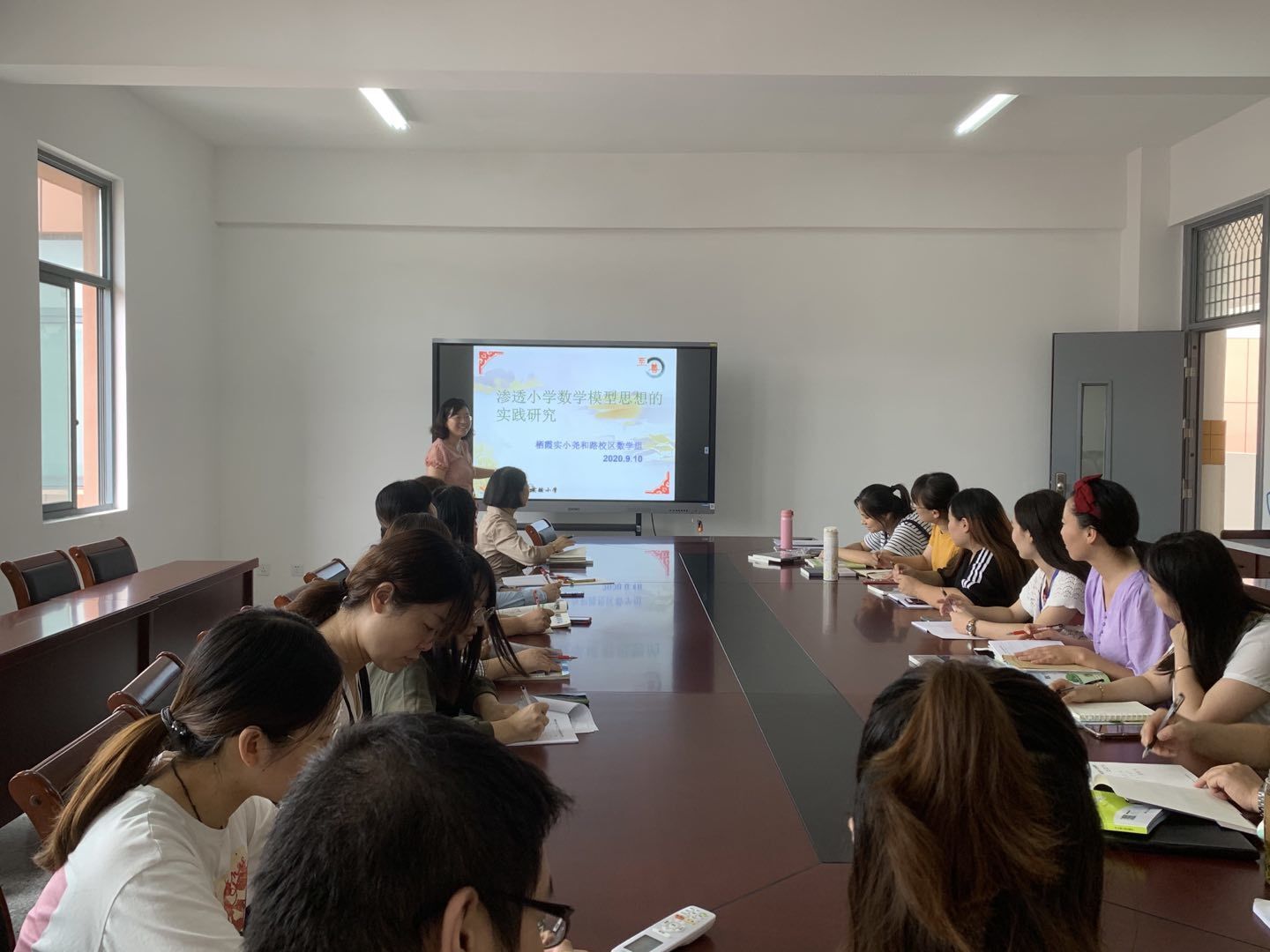 首先由教研组长陈艳平老师介绍校本研修的主题——《渗透小学数学模型思想的实践研究》,陈老师结合教材中的具体课例讲解研究的内容、目标、方式等,让老师们感受到:不论是第一学段,还是第二学段,数学模型思想都可以潜移默化地渗透在教学中。