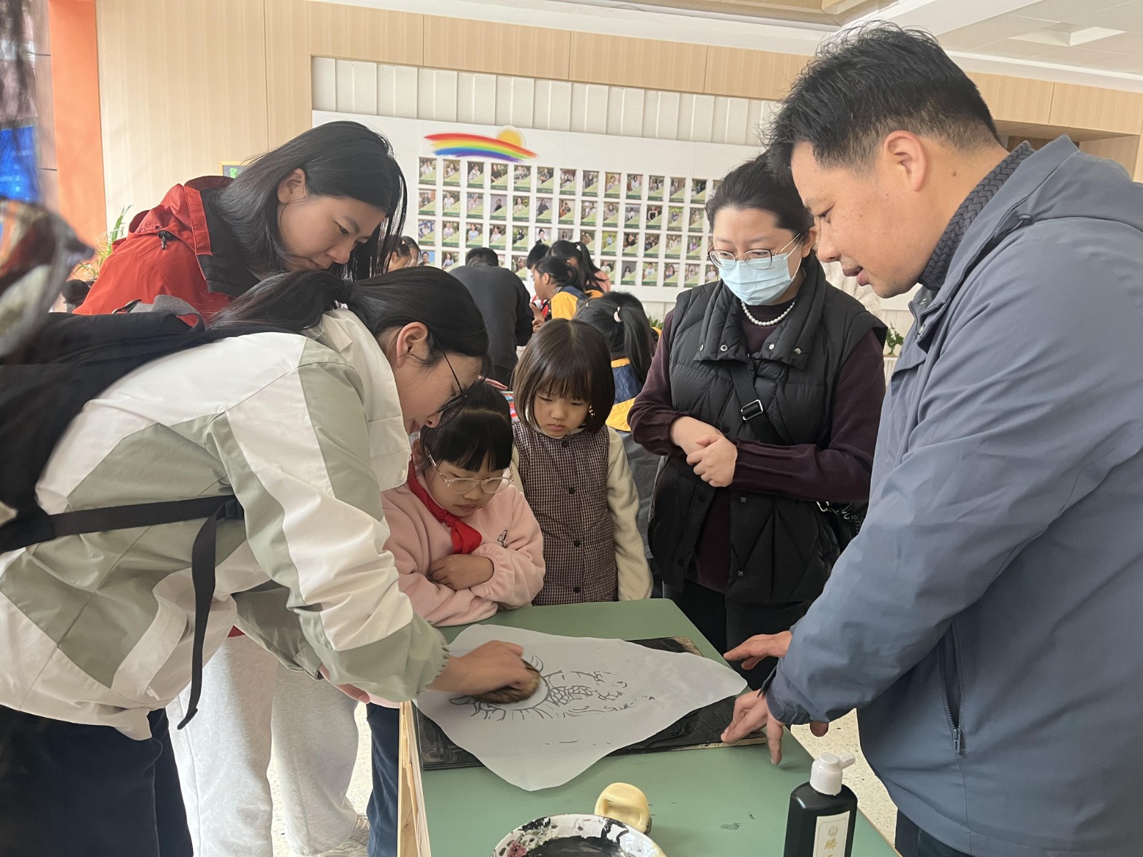 初入学校,与会专家和骨干教师们就被学校中庭的体验活动所吸引。泥塑、风筝、剪纸等体验区一字排开,学校邀请南京风筝技艺代表性传承人张堡程老师一旁做单独指导。骨干教师们驻足停留,细心观察,积极尝试,亲手制作泥塑作品、绘制风筝图案、裁剪精美剪纸,领略传统艺术的魅力,感受传统文化与劳动教育的融合。一旁的展板展示了学校劳动基地——和娃农场的建设过程;学生们通过思维导图、时间轴的形式展示了假期自己种植碗莲、豆芽、大蒜、西瓜的观察记录与成果,也让参观教师们在劳动教育领域的探索与感悟更加直观。
