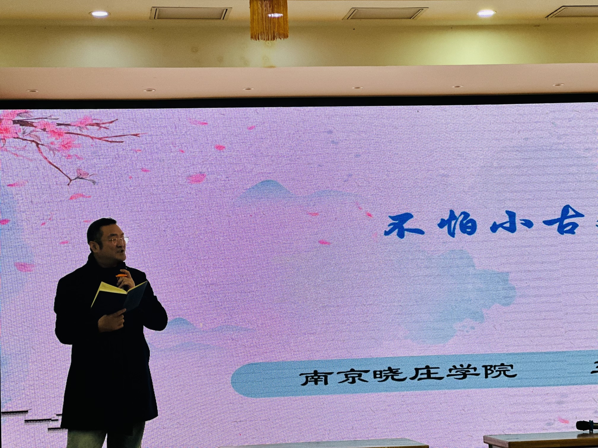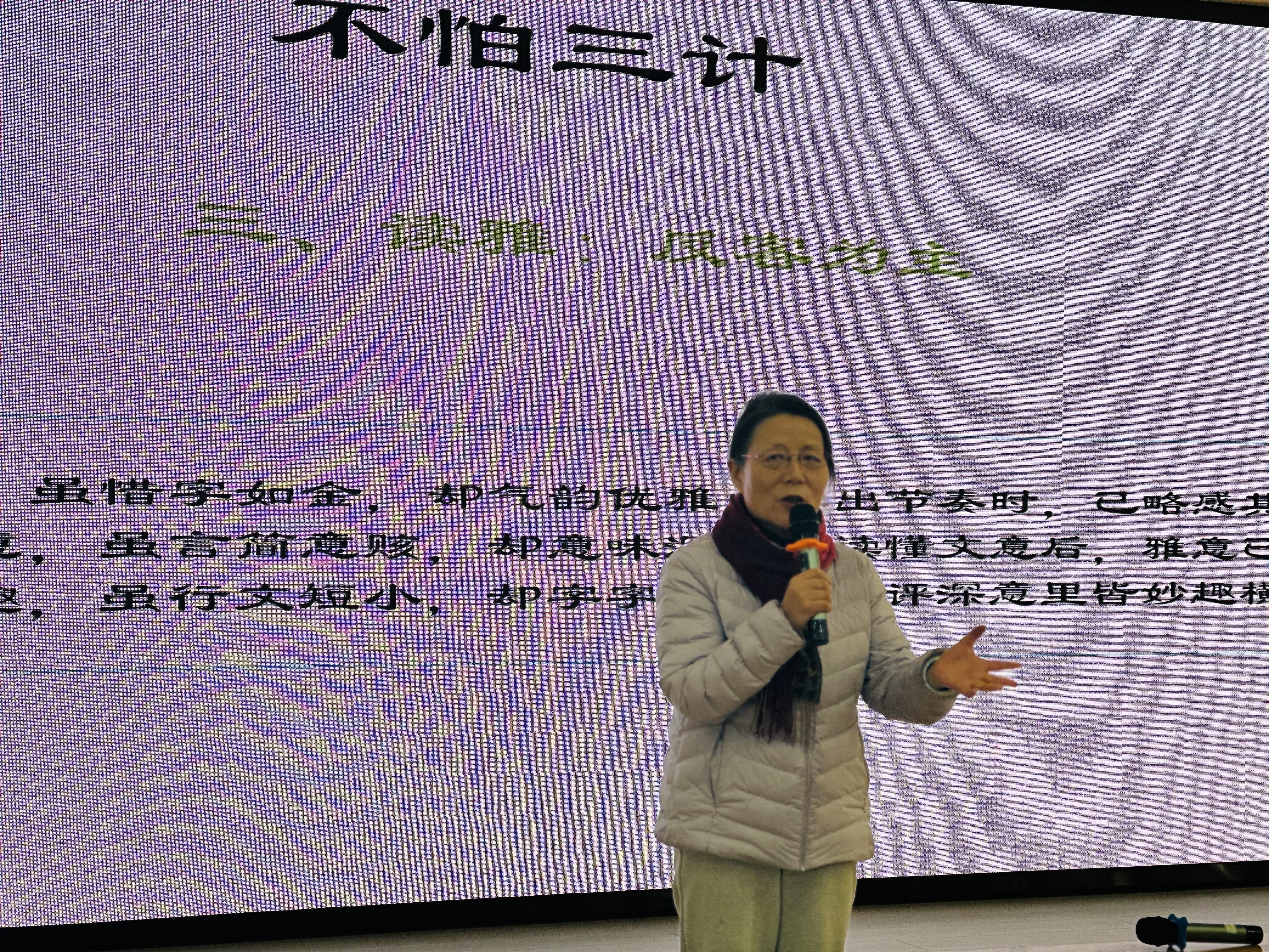 两节课后,来自南京晓庄学院的王宗海教授带来了一场主题为《不怕小古文》的讲座。王宗海教授以其深厚的专业知识和丰富的教学经验,为在场教师提供了关于小古文教学的新思路和方法,王教授指出古文的学习一是培养阅读古文的兴趣,二是打开思维,吸引孩子朗读,朗读的指导就是在朗读中帮助理解。王教授把古文的教学比作“小火慢炖”,学生在朗读中有思考,在朗读中有收获,在朗读中有提升。