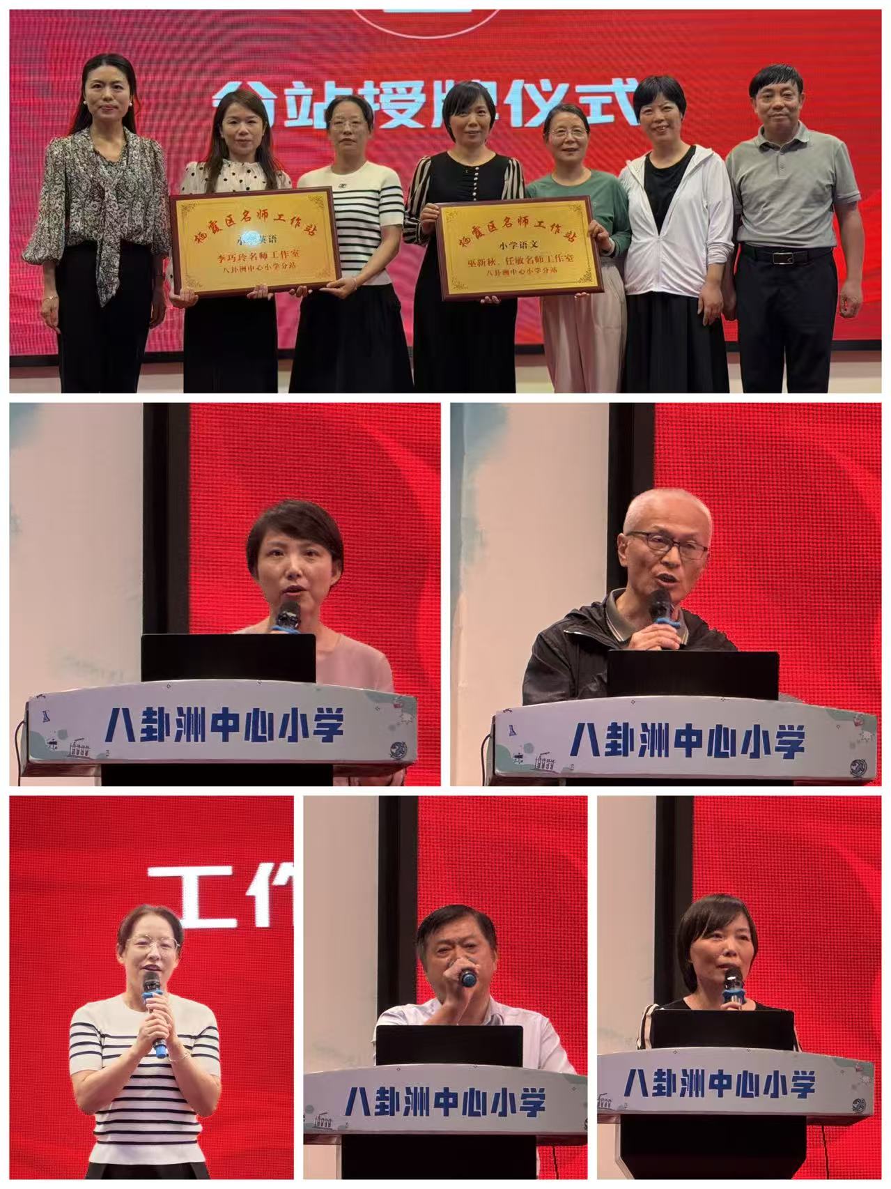 名师工作站分站授牌仪式中,区教师发展中心胡荣华副校长宣读《栖霞区名师工作站分站建设规划》;区教育局周文金科长和王勃科长为两个名师工作室分站授牌;八卦洲中心小学施鸿梅副校长作为名师工作室分站主持人进行表态发言;栖霞区教师发展中心李巧玲主任作为名师工作室主持人代表对工作站分站全体成员深情寄语;八卦洲中心小学蒋宁书记作为分站设立学校领导进行讲话;栖霞区教育局陈婷婷副局长对活动及名师工作站分站后续工作作出指示:发挥名师示范引领作用,做长效引路的推动者,做经验分享的传播者。活动由八卦洲中心小学副校长梁俊主持。